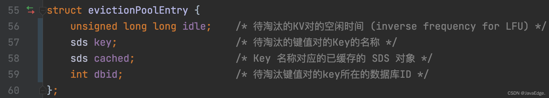 为淘汰资料,Redis定义阵列EvictionPoolLRU,保存待淘汰的候选KV对,元素型别是evictionPoolEntry结构体,保存了待淘汰KV对的空闲时间idle、对应K等信息: