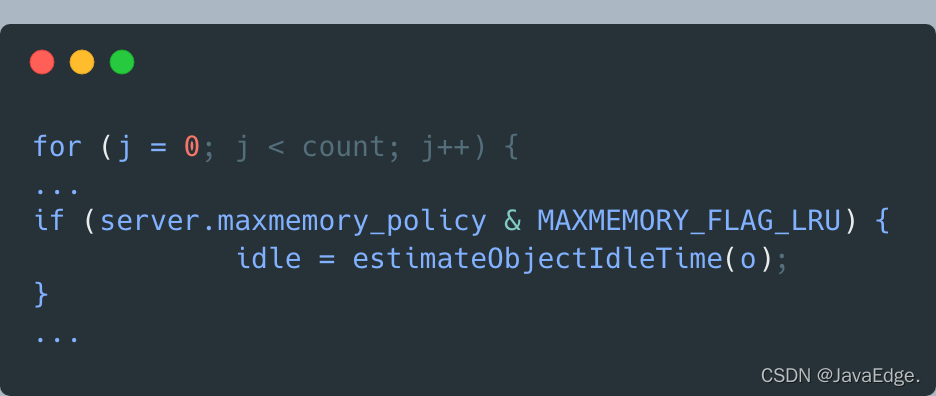 于是,dictGetSomeKeys回传采样的KV对集合,evictionPoolPopulate根据实际采样到的KV对数量count,执行回圈:呼叫estimateObjectIdleTime计算在采样集合中的每一个KV对的空闲时间: