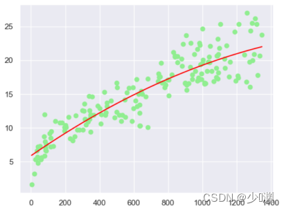 我们将PolynomialFeatures的degree属性设定为2,也就是关于微信投放量信息X的二次多项式,然后我们选择一百八十个资料进行训练,并且打印出训练后曲线和原散点图的影像: