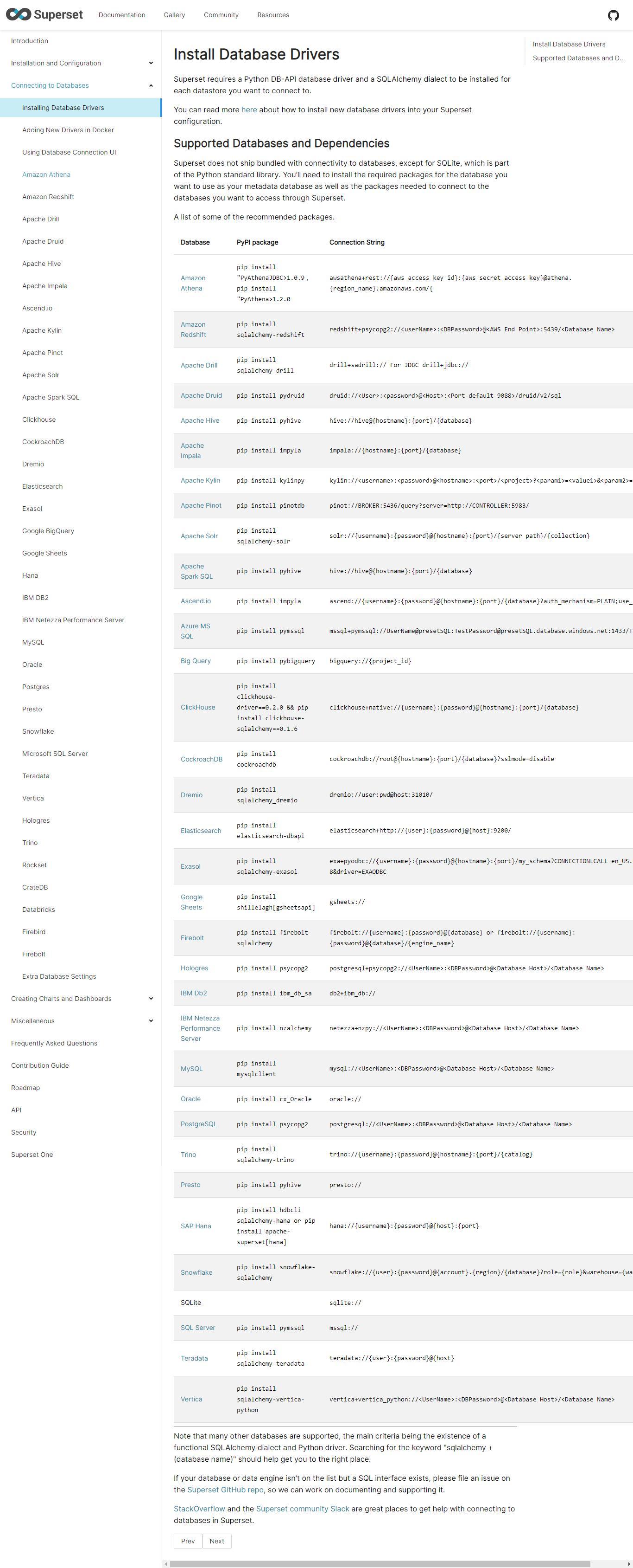 SQLite是Superset默认自带的数据库,如果需要访问其他型别的资料,则需要安装对应的数据库驱动,绝大多数主流数据库都支持,比如clickhouse、sap hana等,具体如下图: