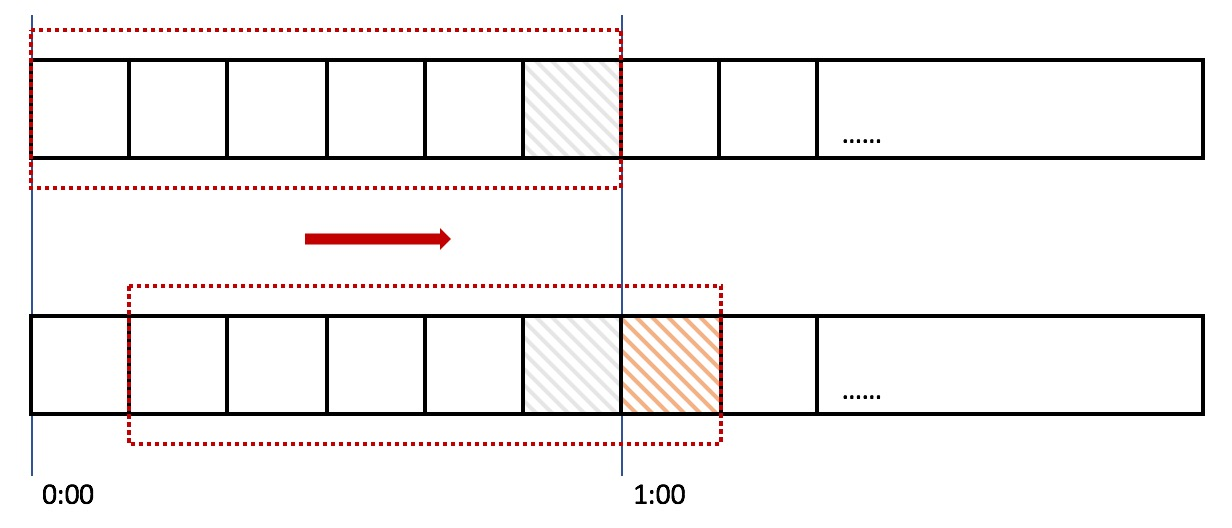 上图,0:59到达的100个请求会落在灰色的格子中,而1:00到达的请求会落在橘黄色的格子中,当时间到达1:00时,视窗会往右移动一格,那么此时时间视窗内的总请求数量一共是200个,超过了限定的100个,所以此时能够检测出来触发了限流,