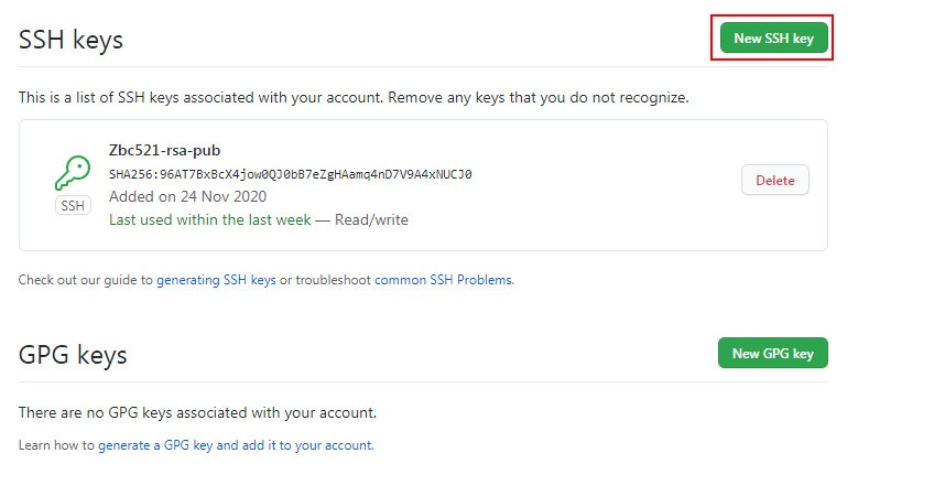 - 登录 GitHub 账号,打开 /settings/SSH and GPG keys,新建 SSH key;