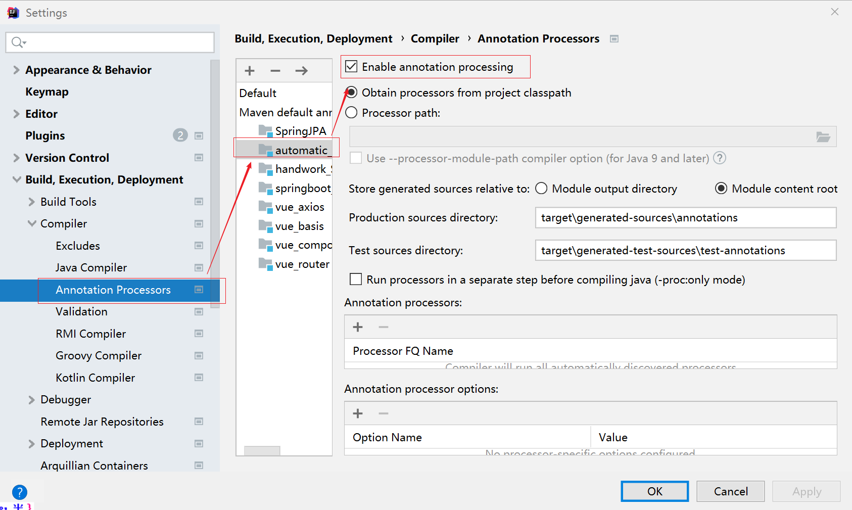 • 点击File-- Settings设定界面,开启 AnnocationProcessors:
