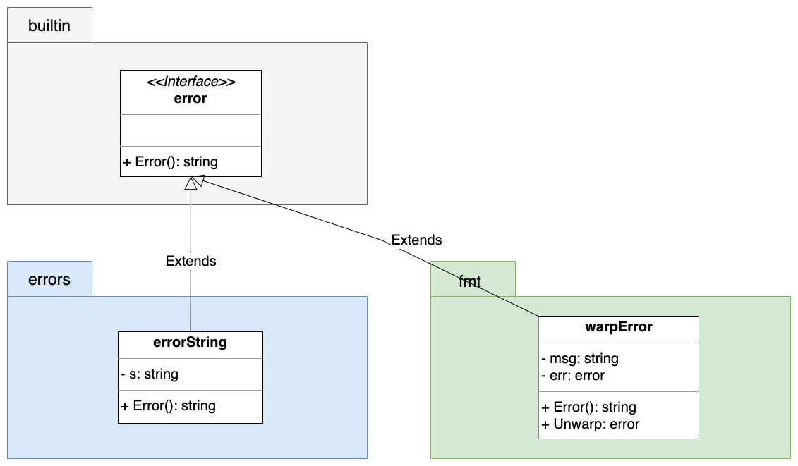 Go 扩展了 fmt.Errorf() 函式,增加了一个 %w 识别符号来创建 wrapError