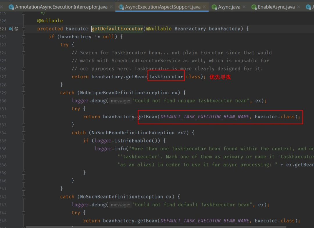 由于AsyncConfigurer的默认执行绪池在原始码中为空,Spring通过beanFactory.getBean(TaskExecutor.class)先查看是否有执行绪池,未配置时,通过beanFactory.getBean(DEFAULT_TASK_EXECUTOR_BEAN_NAME, Executor.class),又查询是否存在默认名称为TaskExecutor的执行绪池,