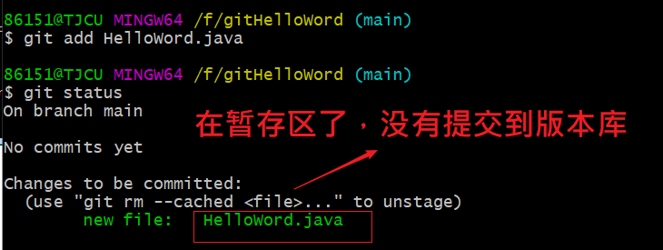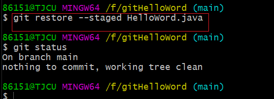 • 撤销暂存区操作:git restore --staged HelloWord.java
