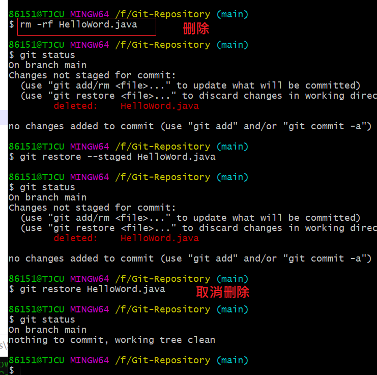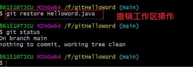 • 撤销作业区操作: git restore HelloWord.java