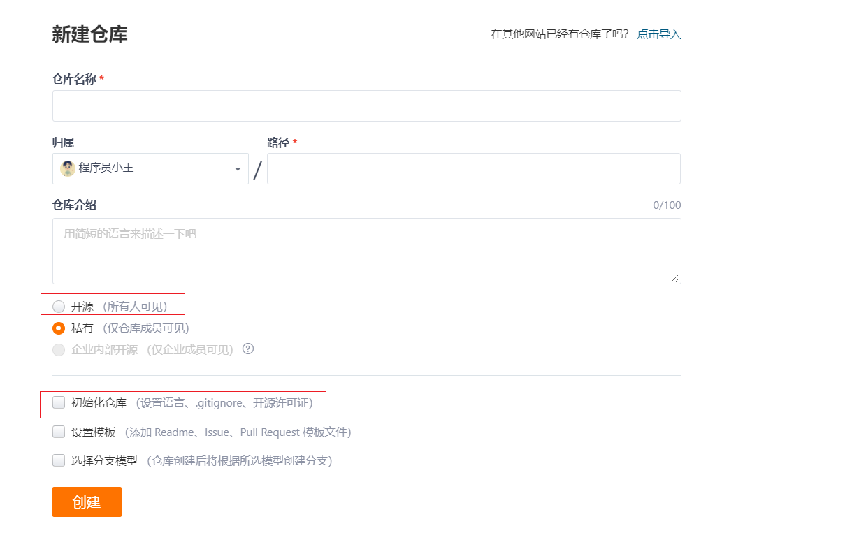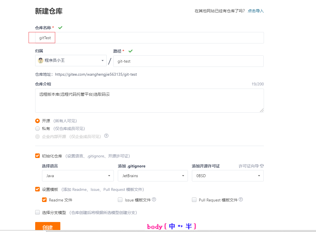 选择新建仓库–>填充仓库名称–>填充介绍–>选择开源–>选择创建