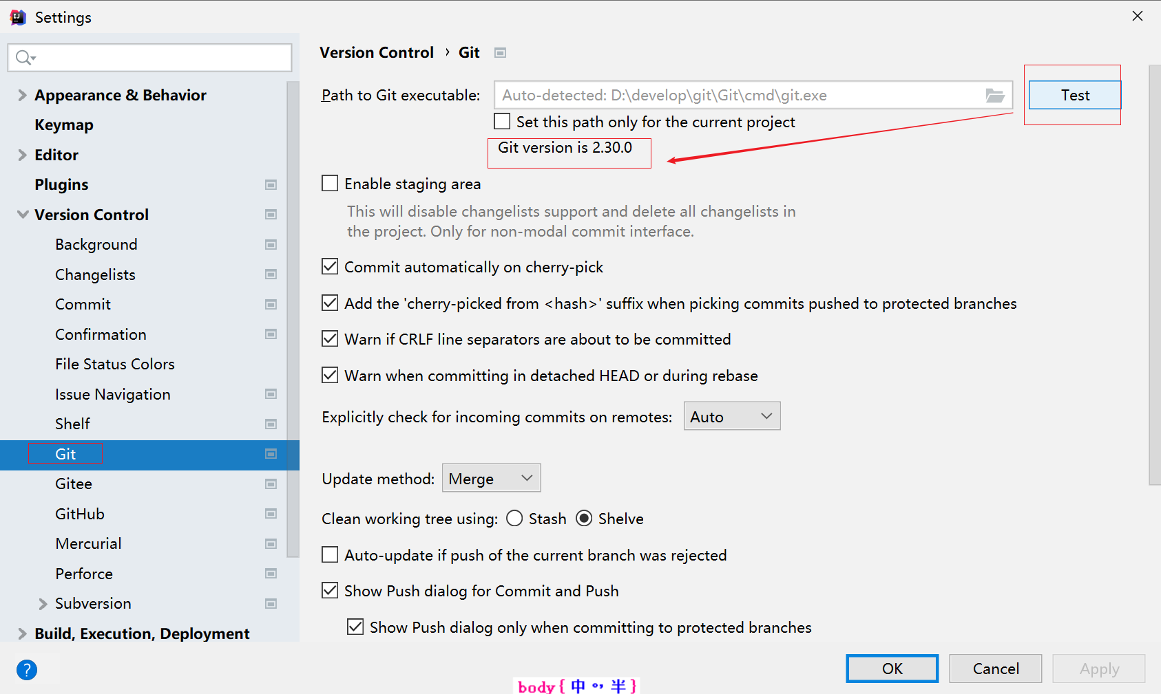 File | Settings | Version Control | Git | 点击右上角 Test 测验git环境是否正常 (展示版本号表示正常)