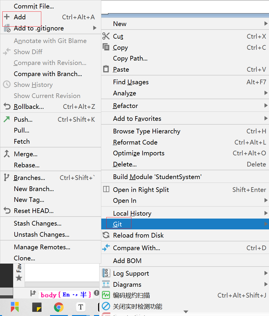 • 添加暂存区 :右击要提交档案/档案夹–>Git–> + Add