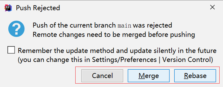 • a、此时提交会弹框提示 提供三个解决方案:Cancel(退出) | Merge(合并) | Rebase(退回当前状态)