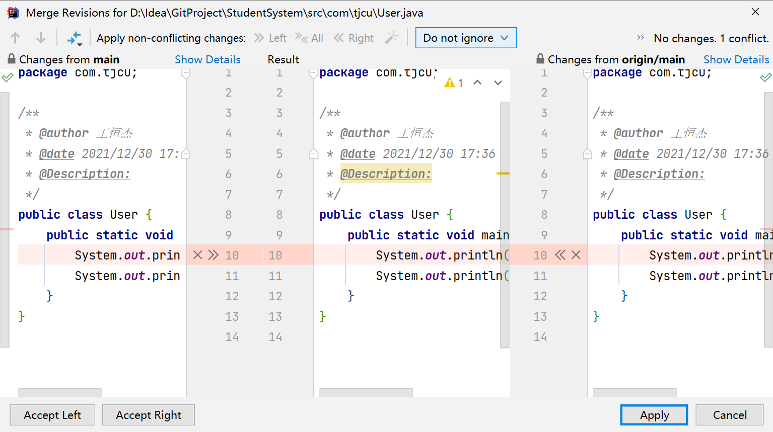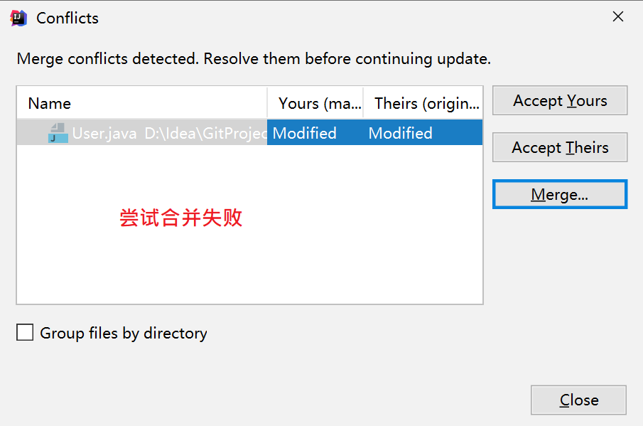 2、代码有交集 再次弹框 提供三个解决方案:Accept Yours(使用pull者) | Accept Theirs(使用远程) | Merge (手动)