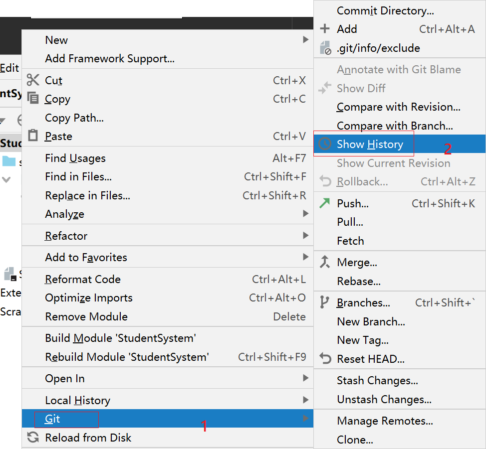 9、查看历史版本 右击要回退档案/档案夹–>Git–>Show History