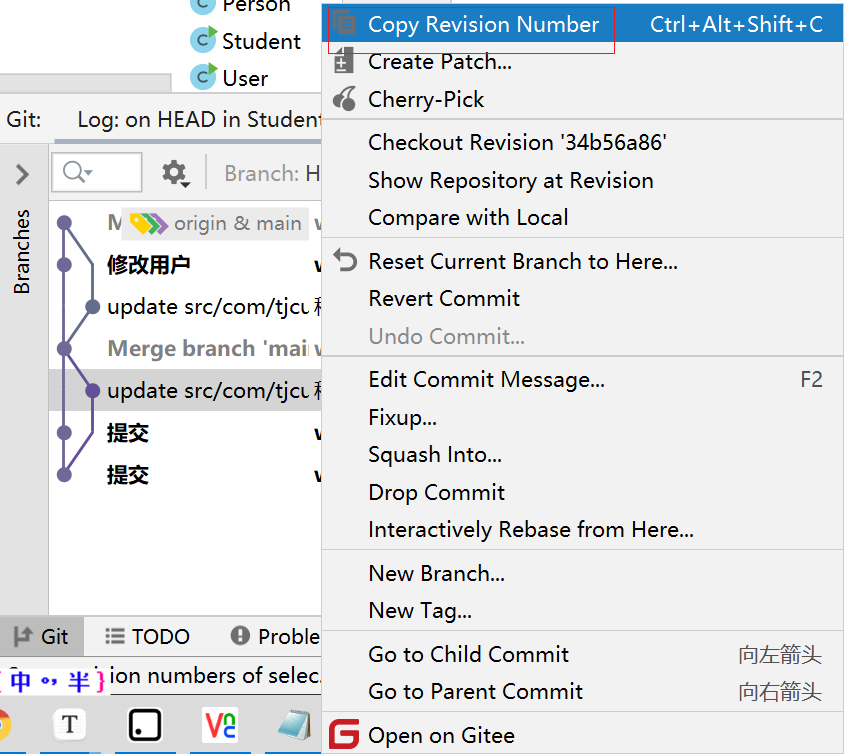 a、选择要回退的版本id 右击要回退档案/档案夹–>Git–>Show History -->选择要回退版本 右击–> Copy Revision Number