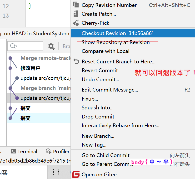 b、选择当前视窗同行的 Log视窗 --> 选择要回退版本 右击 --> Checkout ReVision ‘xxxxxx’