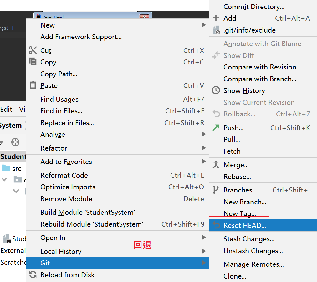 b、右击要回退档案/档案夹–>Git–>Reset HEAD