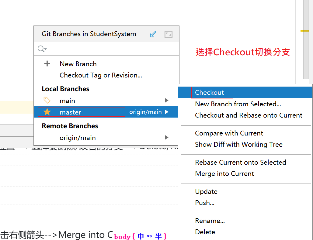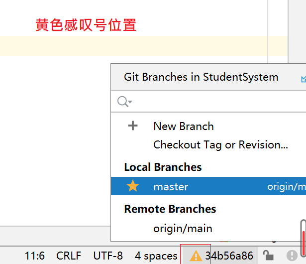 点击IDEA右下角黄色感叹号位置–>选择要切换的分支–>点击右侧箭头–>选择Checkout