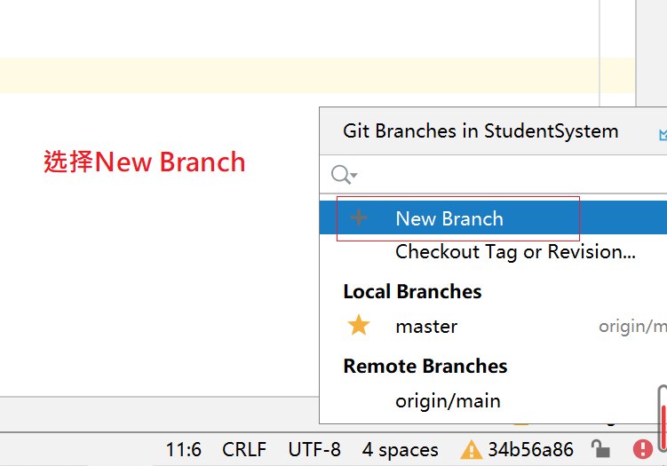点击IDEA右下角黄色感叹号位置–>new Branch–> 填写分支名 -->确认