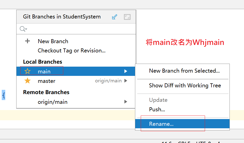 点击IDEA右下角黄色感叹号位置 -->选择要洗掉/改名的分支 -->Delete/Rename