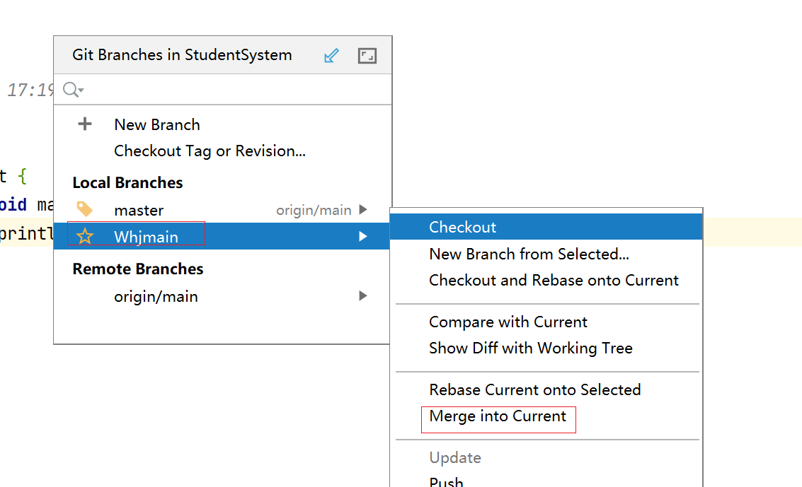 b、合并前切换到主分支