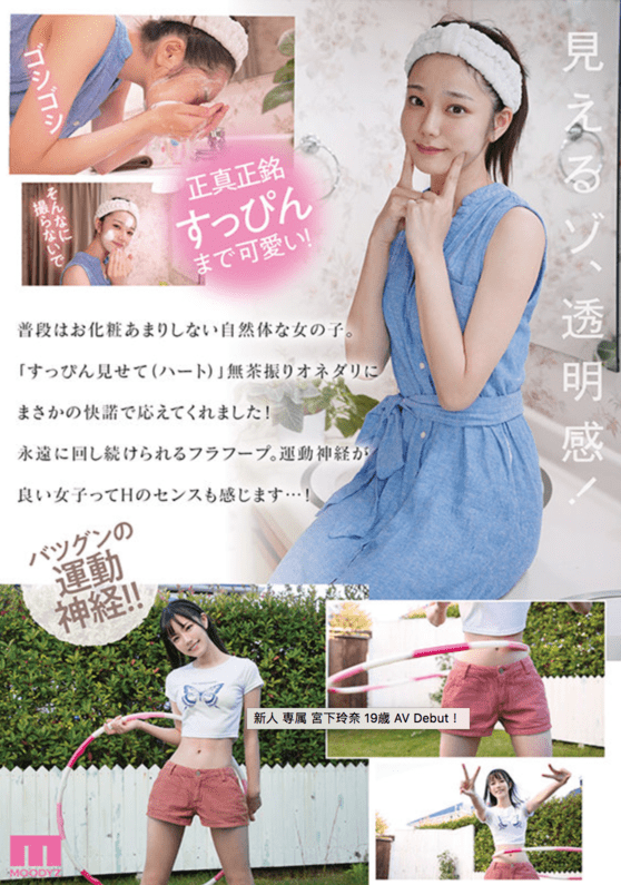 据现有情报指出,年仅19 岁的宫下玲奈不仅散发「透明系」魅力、C cup 的上胸加上些微肉感的曲线,绝对能说邻家女孩感爆棚!甚至在AV Debut 上、宫下玲奈还拍摄卸妆后的容颜,而依旧超可爱的脸蛋、令她短时间就获得老司机们的争相关注,官方Twitter 在创立不到一个月的期间已近万人追踪。