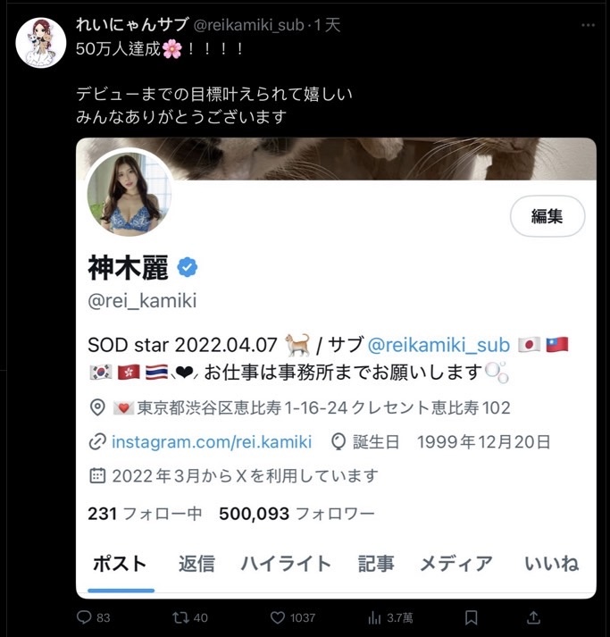 然后她的X( https://twitter.com/rei_kamiki )就破50万追踪了!